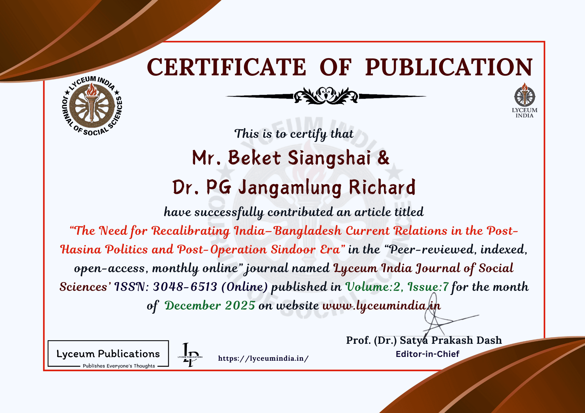 | Title: The Need for Recalibrating India–Bangladesh Current Relations in the Post-Hasina Politics and Post-Operation Sindoor Era | ||
