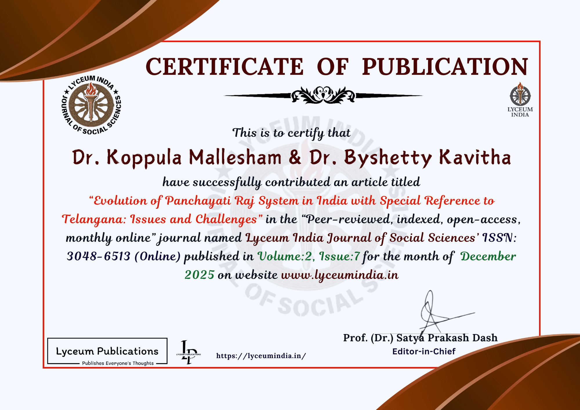 | Title: Evolution of Panchayati Raj System in India with Special Reference to Telangana: Issues and Challenges | ||