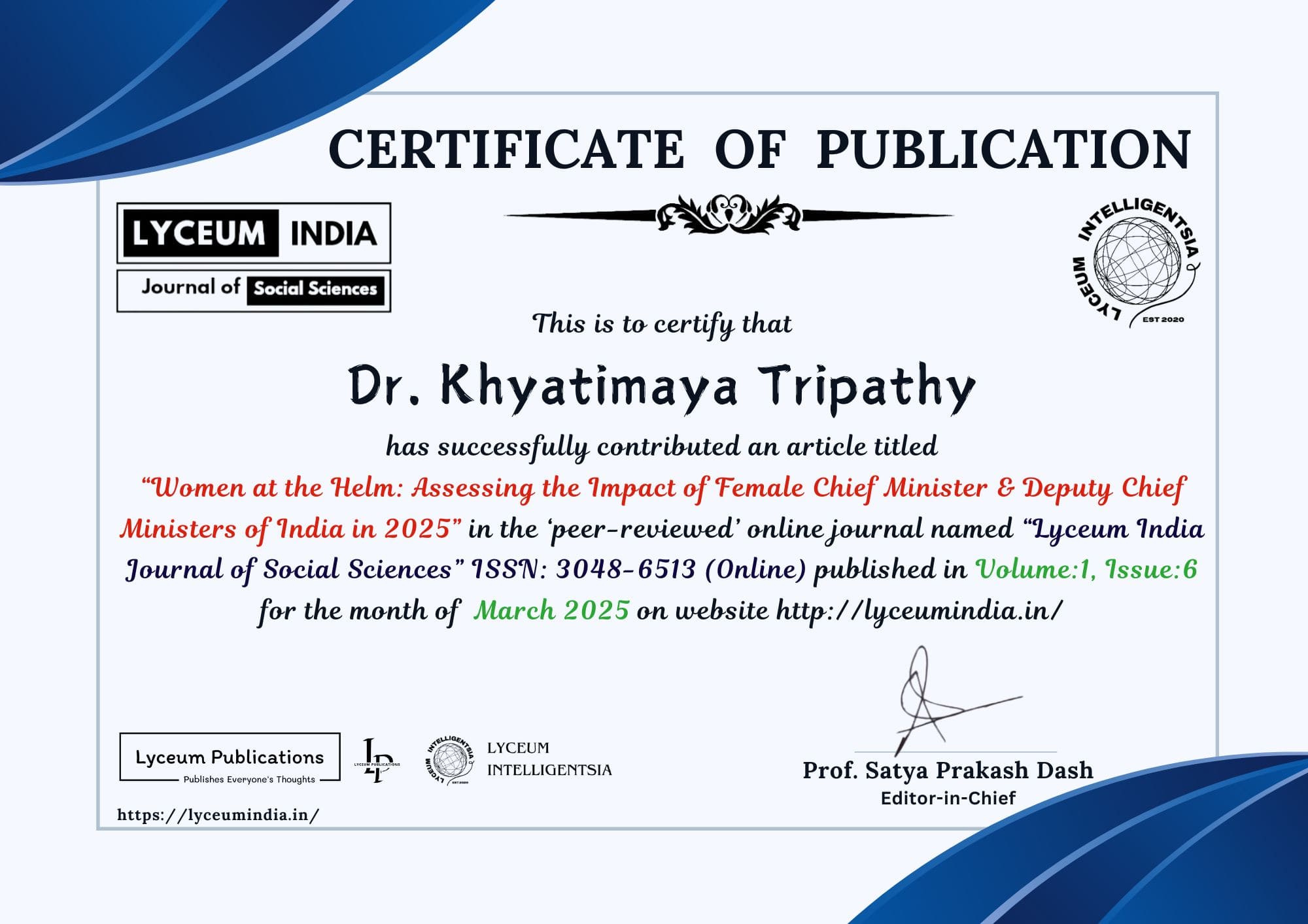 | Title: Women at the Helm: Assessing the Impact of Female Chief Minister & Deputy Chief Ministers of India in 2025 | ||